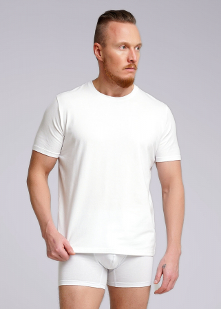 Футболка мужская из трикотажного полотна, с круглым вырезом горловины и коротким рукавом. Материал эластичен, не сковывает движений, благодаря хлопку в составе обладает дышащими свойствами.