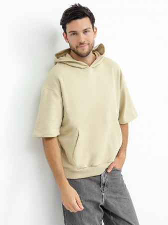 Свободное мужское худи прямого силуэта с широкими рукавами до локтя. Выполнено из легкого трикотажного футера без подчеса. Из особенностей – просторный капюшон и вместительный карман-кенгуру. Спущенная линия плеча дарит особый комфорт и свободу движений. Рекомендуем для стильных городских луков!
