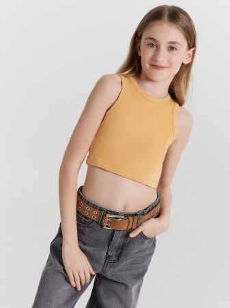 Топ для девочек прилегающего силуэта. Горловина круглая. Проймы и горловина окантованы бейкой из основного полотна. Низ изделия обработан швом в подгибку.