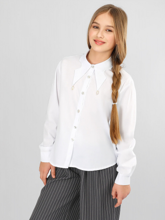 Блузка для девочки Соль&Перец, на пуговицах, из натурального хлопка. Блузка свободного кроя, с удлинённой спинкой. Отложной, фигурный воротник декорирован бусиной со стразами. Пуговицы украшены золотистыми вставками. Классический элемент школьной формы прекрасно дополнит гардероб каждой девочки.