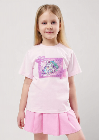 Хлопковая футболка умеренного обьема. Изюминка модели оригинальная пайеточная нашивка по переду. Отлично будет сочетаться с юбкой, шортами или брюками из блока.