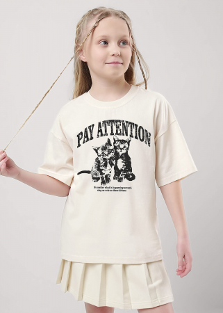 Стильная футболка из хлопкового трикотажного полотна прекрасно дополнит твой гардероб. Модель кроя оверсайз дополнена эластичной горловиной и ярким принтом. Создавай стильные яркие образы, сочетая модель с юбкой или брюками из новой коллеции!