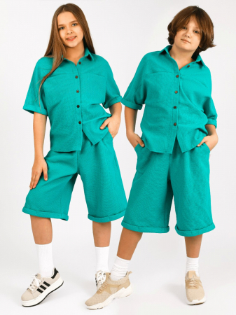 Летний детский костюм Соль&Перец, выполнен из натурального хлопкового вафельного трикотажа. Рубашка свободного кроя с потайными карманами на груди, удлинённые шорты с карманами, по талии на широкой, эластичной резинке. Костюм из хлопковой ткани вафельной текстуры хорошо пропускает воздух, защищает от солнца и подходит для чувствительной кожи. Отличный вариант для летнего отдыха.