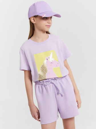 Свободные шорты для девочек, выполненные из трикотажного футера. Пояс с эластичной тесьмой внутри и регулировочным шнурком-завязкой. Рекомендуем!