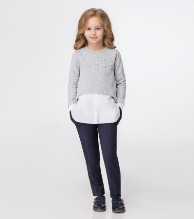 Джемпер для девочки из трикотажного хлопкового полотна в сочетании с белой сорочечной тканью. Джемпер имитирует двухслойность. Джемпер полуприлегающего силуэта, с длинными рукавами с притачными белыми манжетами, с круглым вырезом горловины. Горловина обработана притачной планкой. Передняя часть джемпера имеет фигурный подрез по низу, от подреза вставка из сорочечной ткани .Спинка чуть удлиненная. Джемпер дополнен по переду бусинками разной величины. Такой джемпер отлично сочетается с классическими брюками, создавая строгий образ школьника, или с любимыми джинсами для активного отдыха.Размер 30-122: Длина изделия - 48см, Длина рукава - 42.5см, Ширина плеча - 5см, Ширина по груди - 36см, Ширина по низу - 37см;