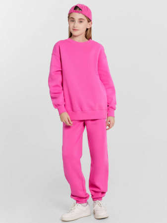 Джемпер свободного силуэта. Рукава длинные, втачные. Линия плеча спущена. Перед и спинка цельнокроенные. Горловина круглой формы обработана обтачкой из рибаны. По низу рукавов и джемпера притачены манжеты и пояс из рибаны. Брюки свободного силуэта. Посадка средняя. Цельнокроеный пояс с эластичной тесьмой внутри. По поясу выполнены три декоративные строчки. По низу брюк застрочена внутрь эластичная тесьма.