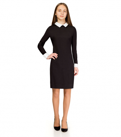 Платье для девочки полуприлегающего силуэта, с длинным втачным рукавом, со съемным воротничком и манжетами. По переду платья имеются нагрудные вытачки и боковые карманы. По спинке - талиевые вытачки. Воротничок и манжеты съемные на потайных петлях и пуговицах, что обеспечивает практичность. Платье без подкладки.Размер 50-158: Длина изделия - 87см, Длина рукава - 62.5см, Длина до талии - 41.6см, Ширина плеча - 10.5см, Ширина по бедрам - 55см, Ширина по груди - 52см, Ширина рукава - 17.5см;