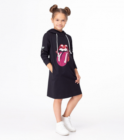 Стильное платье для девочки из хлопкового трикотажного полотна. Платье полуприлегающего силуэта, с длинными рукавами, с капюшоном, длиной до коленей. В боковых швах имеются карманы. Платье дополнено ярким модным молодежным рисунком по переду.Размер 30-128: Длина изделия - 66см, Длина рукава - 49.5см, Ширина плеча - 8см, Ширина по бедрам - 39см, Ширина по груди - 36см, Ширина рукава - 13.5см;