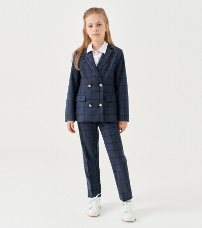 Стильный двубортный жакет для девочки из поливискозной ткани с рисунком в клетку. Жакет на поливискозной подкладки. Жакет полуприлегающего силуэта, с воротником, с V-образным вырезом горловины, со сквозной застежкой на петли и пуговицы. Рукава длинные. На жакете выполнены рельефы, обеспечивающие отличную посадку по фигуре. По переду имеются карманы с клапанами. Очень стильный модный жакет для модных школьниц.Размер 30-122: Длина изделия - 43см, Длина рукава - 47см, Ширина плеча - 8см, Ширина по груди - 33см, Ширина по низу - 38см, Ширина рукава - 14см;