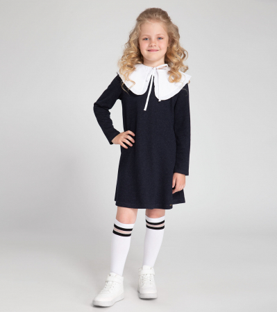 Базовое платье для девочки из трикотажного вискозного полотна. Силуэт платья - трапеция. Горловина платья круглая. Рукава длинные, втачные, одношовные. Спинка со средним швом. В верхней части среднего шва спинки расположен разрез и застежка на пуговицу на ножке и петлю из сутажа. На переде платья по низу расположен декоративный элемент лейба металлическая. Так же платье декорировано съемным белоснежным воторничком из хлопковой ткани. Он придает особую нарядность и торжественную строгость платью. Воротничок скреплен с платьем временной строчкой по плечевому шву. Платье обеспечит комфорт и удобство. Такое базовое платье отличный вариант для школьных будней.Размер 36-146: Длина изделия - 74см, Длина рукава - 52.5см, Ширина плеча - 10.5см, Ширина по бедрам - 48см, Ширина по груди - 41см, Ширина рукава - 14см;