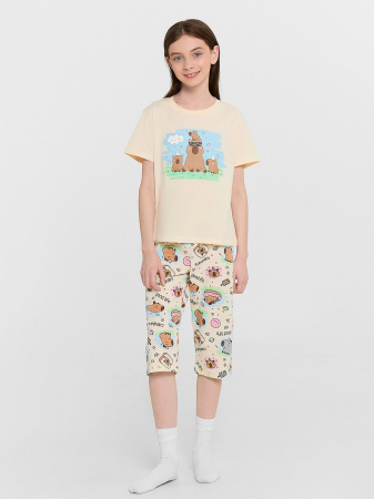 Комплект изготовлен из кулирки. Фуфайка свободного силуэта. Перед и спинка цельнокроенные. Длина до середины бедра. Рукав втачной, короткий. Горловина круглой формы, обтачка из полотна рибана. Низ подложен. Бриджи прямого силуэта. Длина чуть ниже колена. В пояс втачена эластичная тесьма. Низ бридж обработан швом вподгибку.