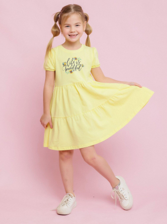 Платье с коротким рукавом для девочек в желтом цвете с надписью на груди. Лёгкое летнее платье из набивного трикотажа супрем. Cтильное, яркое и модное платье выполнено из высококачественного хлопка.