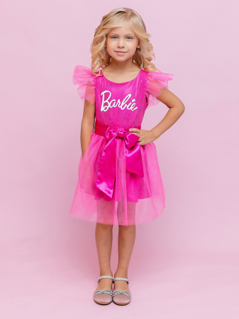 Платье в стиле Барби для девочки розовое с короткими полупрозрачными рукавами. На груди надпись Барби, пояс с бантом спереди. Юбка двойная с верхней частью из фатина. Платье Барби детское подойдет для праздников и фотосессий, смотрится очень нарядно и стильно.