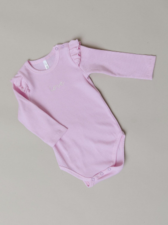 Боди с длинным рукавом для девочки розовый из ткани кашкорсе (натуральный хлопок). Базовая модель с удобными застежками на кнопках в нижней части спереди и на воротнике. Украшено вышитой надписью на груди и оборками на рукавах.