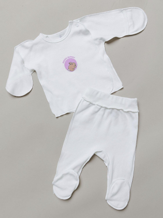 Комплект для девочки трикотажный в молочном цвете: распашонка и ползунки. Изготовлен из 100% хлопка - интерлок - гипоаллергенной и безопасной ткани. Все швы сделаны наружу для комфорта малыша. Распашонка с закрытыми ручками и кнопкой на запахе. Ползунки на мягкой широкой резинке с закрытой пяточкой.