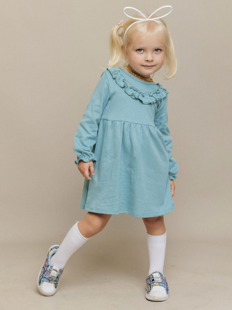 Платье с длинным рукавом в мятном цвете для девочки из натурального хлопка. Милое однотонное платье с оборками на груди и рукавах. Идеальное платье для садика и летних прогулок.