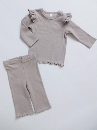 Комплект для девочки трикотажный в расцветке какао: лонгслив с длинным рукавом и брюки. Удобная одежда из трикотажного полотна кашкорсе станет незаменимой вещью для ребенка на теплую весну и лето. Костюм для девочки создан специально для новорожденных малышек от 2 месяцев до 2 лет.