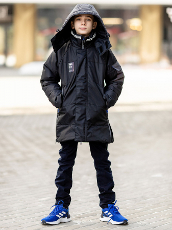 Парка для мальчика Грант удлиненного силуэта с боковыми молниями в черном цвете. Черный - классика, которая не сходит с подиумов уже несколько сезонов. В качестве отделки на съемном капюшоне, по спинке, в кармане и рукавах использована голографическая ткань. Яркие акценты из синего однотона на планке по спинке, внутренней ветрозащитной планке и внутреннем клапане на рукаве. Навесы на центральной молнии и молниях прорезных карманов. Декорирована парка термотрансфером по спинке и воротнику как с внешней, так и внутренней стороны и голографической нашивкой на груди. Удобный регулируемый капюшон с высокими уступами для защиты от ветра. Внутренняя утяжка по талии, внутренний карман и бретели свободные руки.