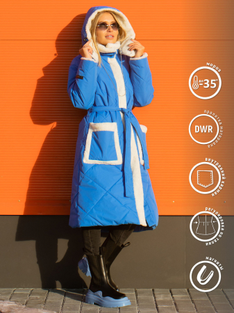 Пальто для девочки Герда зимнее из стеганой ткани - мембрана в голубой расцветке с оторочкой искусственным велмехом. Зимнее пальто для девочек batik выполнено из качественной мембранной ткани с водо- и ветронепроницаемым, дышащим и грязеотталкивающим покрытием, благодаря этому в нем будет комфортно в любую погоду. Модное и практичное удлиненное пальто отлично дополнит гардероб и доставит только самые приятные эмоции. Подкладка из микрофлиса, очень мягкая на ощупь, быстро согревает и удерживает тепло, не вызывает аллергических реакций. Пальто имеет приталенный крой с поясом. Два накладных кармана на магнитах по бокам.