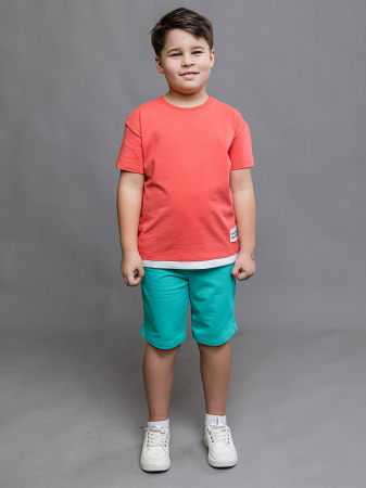Футболка для мальчика коралловая с коротким рукавом из супрема. Прямой крой, круглый вырез горловины, декор в виде нашивки с надписью снизу, имитация второго слоя по низу. Высокое содержание хлопка 92%. Подойдет для занятий спортом и повседневной носки.
