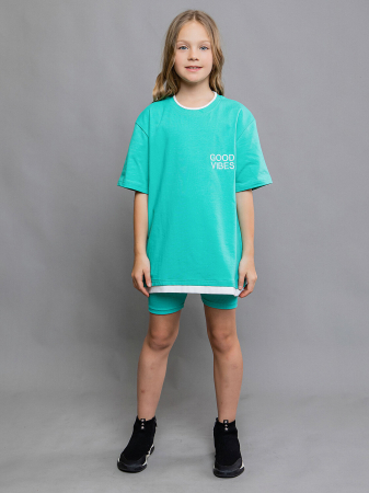 Футболка для детей и подростков с коротким рукавом в зеленой расцветке. Футболка свободного кроя с вышитой надписью и имитацией второго слоя по низу. Будет отлично сочетаться с джинсами, шортами, спортивными костюмами и брюками.