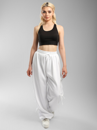 Брюки палаццо женские Соль&Перец в стиле спорт-шик, с лентами по бокам. По талии брюки на широкой, эластичной резинке со шнурком. Низ брючин на кулиске, что позволяет регулировать длину. Брюки выполнены из износостойкой трикотажной ткани Лининг которая долго сохраняет форму и привлекательный внешний вид.