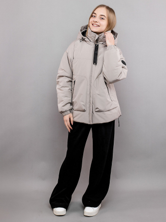 Куртка для девочки демисезонная ЭФФИ серебристо-бежевая из мягкой мембранной ткани и подкладом из мягкого ворсового трикотажа. Куртка с оригинальной декоративной стежкой со спущенным плечом, высоким воротником, объемными накладными карманами оригинальной формы с молнией. Наружная ветрозащитная планка с перегибом, защищающим от защипа. Капюшон съемный на молнии и регулировкой по лицевому краю. Рукав с эластичной манжетой и регулировкой по ширине патой с кнопкой. Низ куртки с удлиненной спинкой и регулировкой по ширине. На молнии борта декоративный патч со светоотражающим принтом.