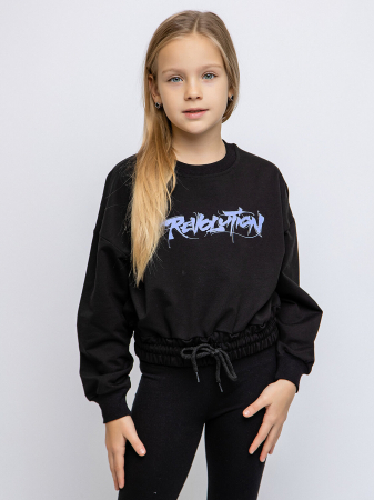 Свитшот (пуловер) черный укороченный на резинке. Спущенный рукав, круглая горловина и широкие манжеты рукавов. На груди принт в виде надписи. Мягкая и теплая ткань футер на основе высококачественного хлопка обеспечит долгую службу изделию и сохранит его первозданный вид даже после многочисленных стирок.