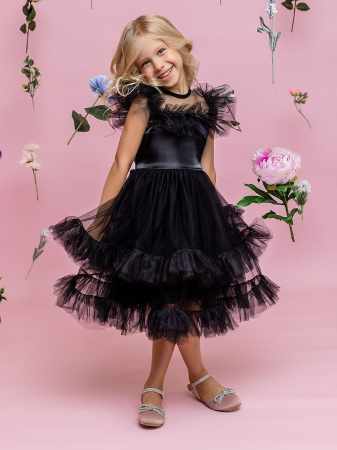 Нарядное платье batik Марисса черное из фактурной сетки с пышной юбкой. Короткие объемные рукава-реглан из еврофатина. Низ платья объемный, укреплен регилиновой лентой. Пышная юбка придает образу воздушность и легкость, а рукава-крылья добавляют загадочности и волшебства.