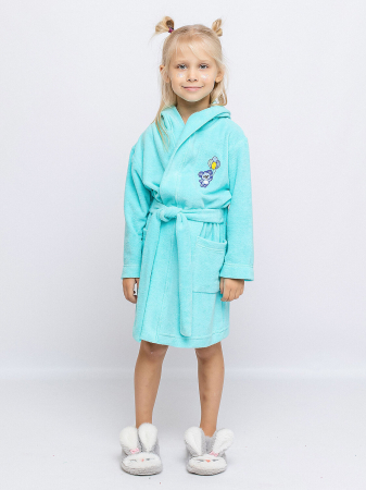 Халат махровый для девочки мятного цвета с нашивкой на груди. Большой капюшон, глубокие карманы и удобный пояс. Выполнен из прочной односторонней махры, отлично впитывающей влагу. Мягкий и комфортный халатик на каждый день.