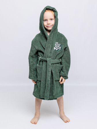 Халат махровый для мальчика зеленого цвета с нашивкой на груди. Большой капюшон, глубокие карманы и удобный пояс. Выполнен из прочной двухсторонней махры, отлично впитывающей влагу. Мягкий и комфортный халатик на каждый день.