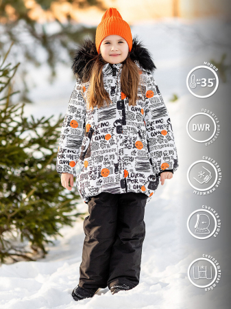 Комплект для девочки Коби в черно-белой расцветке с принтом в виде надписей. Куртка имеет удлинение по спинке и хорошо защитит от холода с помощью внутренней утяжки по низу, трикотажных снегозащитных манжет по рукавам и регулируемого капюшона со съемной опушкой. Два удобных прорезных кармана с листочкой и ветрозащитная планка на кнопках. Полукомбинезон эргономичного кроя имеет все необходимое: карманы на молниях, регулируемые бретели, снегозащитные манжеты, усиление коленей и светоотражающие канты.