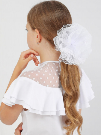 Нарядный, многослойный бант для волос, на прочной резинке. Выполнен из плотной ткани в мелкую сеточку, с ажурным декором. Украсит и разнообразит элегантный школьный образ.