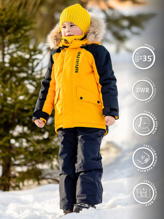 Комплект для мальчика Деннис зимний утепленный с курткой и полукомбинезоном в ярко-желтой расцветке. Капюшон несъемный с искусственной опушкой. В рукавах эластичные манжеты. Молния на куртке с ветрозащитным клапаном и защитой подбородка. Боковые карманы с клапаном. Низ куртки стягивается эластичным шнуром с фиксатором, что помогает предотвращать попадание снега внутрь. Подтяжки брюк эластичные, регулируются по длине и снимаются.