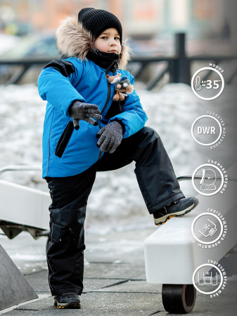 Комплект для мальчика Брэдли состоит из яркой акцентной куртки и полукомбинезона из мембранной ткани практичной расцветки. Куртка с небольшим удлинением по спинке, центральная молния обладает водонепроницаемым эффектом, также имеется ветрозащитная планка с защитой подбородка. Регулировка объема капюшона и съемный искусственный мех. В рукавах предусмотрены трикотажные манжеты. По низу куртки кулиса для регулировки объема изделия, внутри снегозащитная муфта. Брючины оснащены снегозащитными муфтами, которые препятствуют проникновению снега внутрь. Эргономичный крой в области колен обеспечивает хорошую посадку. Места повышенного трения выполнены из особо прочной ткани. Наличие светоотражающих элементов для безопасности ребенка в темное время суток.