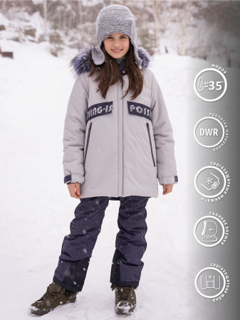 Лаконичный комплект для девочки Юми в контрастной бежево-серой расцветке. Куртка с небольшим удлинением по спинке, двумя карманами в подрезах на молнии. Куртка с втачными рукавами с регулировкой по низу с помощью пат на липучке и снегозащитными манжетами из лайкры. Втачной капюшон со съемной опушкой. По низу куртка регулируется внутренней утяжкой на стоперах. Для защиты от попадания снега в куртке имеется юбка. Полукомбинезон удобной проверенной конструкции на молнии с карманами и регулировкой бретелей.