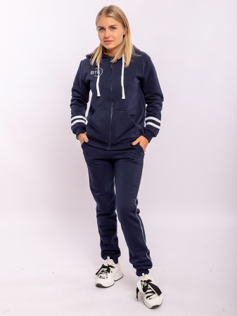 Костюм спортивный состоит из брюк и толстовки с капюшоном на полном замке средней длины, выполненный в синем цвете. Толстовка с карманами и эластичными манжетами рукавов. Брюки так же имеют карманы, резинку в поясе и в нижней части штанин.