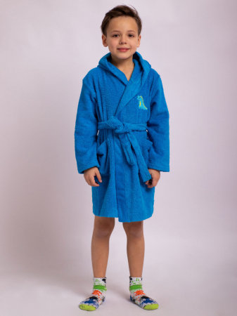 Халат бирюзовый детский с капюшоном из двусторонней махры. Стильный, яркий, красивый халат с нашивкой на груди. Модель халата с поясом на талии и двумя удобными накладными карманами. Халат махровый детский для детей от Batik. Мягкий и пушистый банный халат из 100% хлопка, является экологичным и гипоаллергенным.
