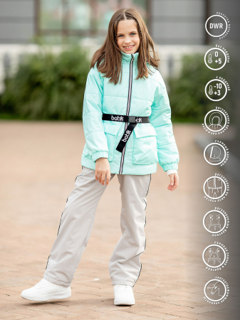 Нежный комплект Флавия для девочки в нежной мятной расцветке из фактурной курточной ткани с водоотталкивающей пропиткой. Спереди накладные карманы и утягивающий пояс на талии. Прямые брюки придают комплекту более классический вид. Фирменные светоотражающие элементы сделают ребенка заметным на дороге в темное время суток.