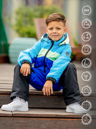 Активный комбинезон для мальчиков и девочек Чойс в ярком лазурном цвете. Утяжки на капюшоне, талии и по низу брюк обеспечивают комфорт и защиту от ветра. Комбинезон можно носить как с поддевой в прохладную погоду, так и без поддевы в теплые дни. Крой не сковывает движения, что позволяет детям активно проводить время на улице, а мембранная ткань с водоотталкивающей пропиткой позволяет комфортно себя чувствовать в любую весеннюю непогоду.