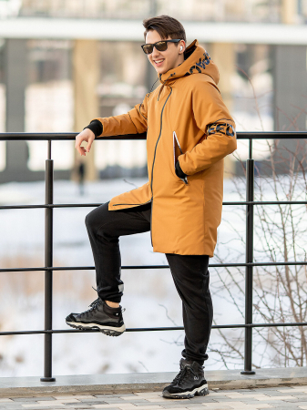 Парка для мальчика демисезонная Эрнест с утеплителем от бренда batik. Коллекция Осень 2022. Парка для детей и подростков в расцветке охра с термотрансферными наклейками в виде надписей. Капюшон, боковые карманы на молниях, застежка по центру, трикотажные манжеты рукавов.