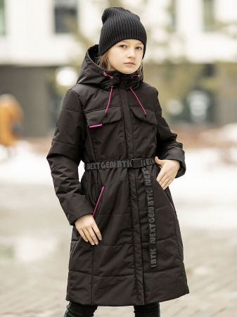 Пальто для девочки утепленное Кэтрин от batik в черной расцветке. Стильное удлиненное пальто для детей и подростков из блестящей ткани подойдет на осень и весну. Капюшон, нагрудные карманы, боковые карманы, застежка на молнию по центру, пояс на застежке.