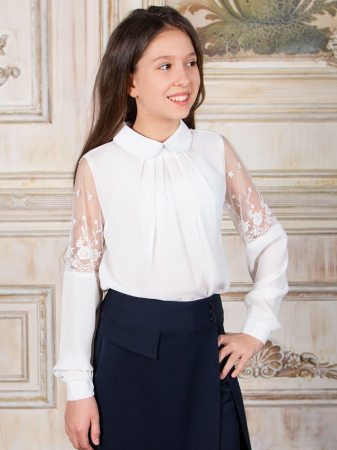 Пышные рукава с манжетами декорированы вставкой из фатина и нежной вышивкой. Блуза имеет дополнительный слой из подкладочной ткани спереди, что делает ее непрозрачной и более комфортной в носке. Ткань-шифон. Прекрасный выбор для школы или торжественного мероприятия.