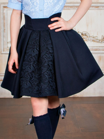 Нарядная юбка - полусолнце, с широким поясом, съёмным подъюбником на пуговицах, декорирована гипюровой вставкой. Идеально сочетается с любой блузкой. Прекрасный выбор для интересного школьного образа.