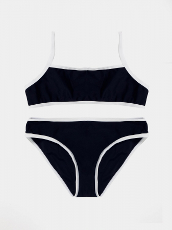 Трикотажное эластичное полотно. Трикотажное полотно, подкладка для купальников. Передняя и задняя детали топа, передняя и задняя детали трусов цельнокроенные. Подкладка передней детали топа и подкладка ластовицы, передней детали трусов из трикотажного полотна. Верхние и нижние срезы трусов и топа обработаны бейкой из основного полотна. По спинке топа застежка. Бретели из основного полотна с надставками, регулируются по длине сзади.