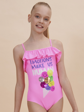 Яркий и модный слитный купальник для девочки. Модель с горизонтальным вырезом горловины подходит для девочек с любым типом фигуры. Тонкие и мягкие бретели не сползают, исключают трение и раздражение. На спинке бретели перекрещиваются, предусмотрена возможность регулировки длины. Детский купальник выполнен из полиамида и эластана — он прекрасно тянется, не теряя при этом своей формы, не выгорает и быстро сохнет. По верхней линии изделие украшено декоративным рюшем. По переду модель декорирована ярким позитивным принтом с пайетками в виде большого разноцветного мороженого, надпись переводится:"эмоции делают нас людьми". Принт эластичный и стойкий, отлично переносит многочисленные стирки. Модель представлена в двух трендовых неоновых цветах: розовый и зелёный. В линейке есть детские купальники следующих размеров: 3 (98): 4-5 (104-110): 6-7 (116-122): 8-9 (128-134): 10-11 (140-146). Купальник красивый подходит для девочек дошкольного, младшего школьного возраста и девочек-подростков. Отличный вариант для летнего отдыха, пляжа, моря и бассейна. Модный купальник — чудесный подарок дочери, внучке или сестре на любой праздник. Выбирайте нужный размер по таблице размеров на фото. Цвет товара на экране вашего устройства может отличаться от цвета изделия вживую. Товар возврату и обмену не подлежит.