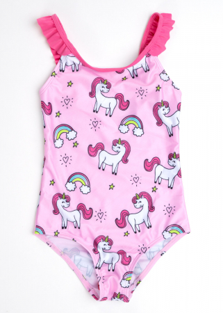 Сплошной купальник в набивку единороги. Узкие контрастные бретели отделаны оборкой. Впереди на подкладе.