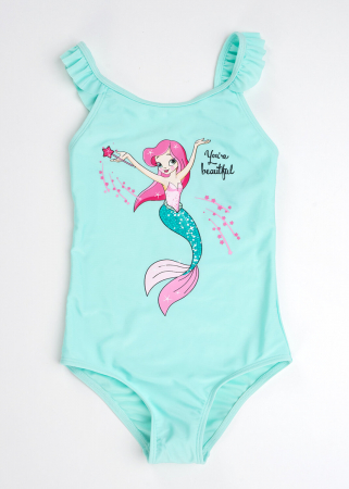 Сплошной купальник с ярким принтом. Узкие бретели отделаны оборкой. Впереди на подкладе.