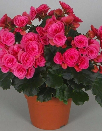 Бегония махровая розовая – клубневое растение высотой 25-35см. Красивы ее зеленые сердцеобразные листья с неровно зубчатыми краями, прекрасны и махровые розовые цветки, похожие на розочки, диаметром до 11см.