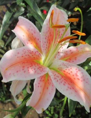 Лилия Салмон Стар (Восточный гибрид) – луковичное растение высотой 90см. Стебли светло зеленые с 6-9 цветками, листья очередные. Направленные вверх цветки – нежно розовые с крапом и оранжево-лососевой полосой, диаметром до 18см, с сильным ароматом. Цветет в июле-сентябре. Используют в групповых посадках, миксбордерах, клумбах и на срезку.